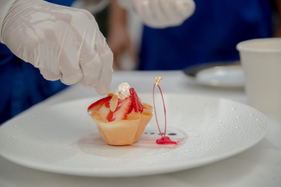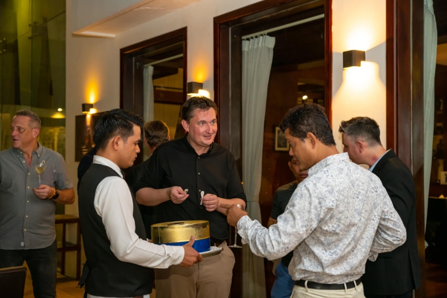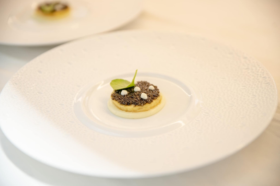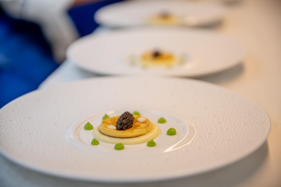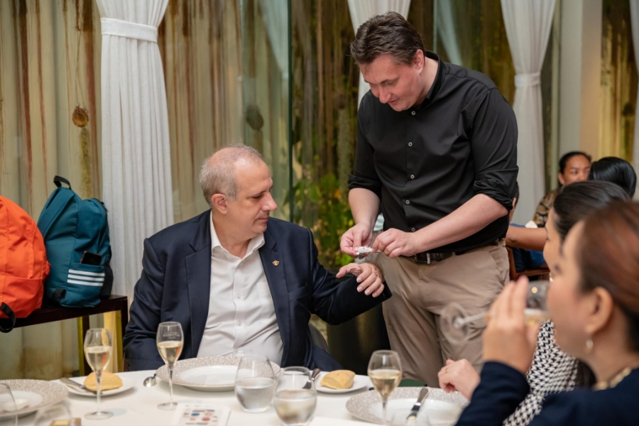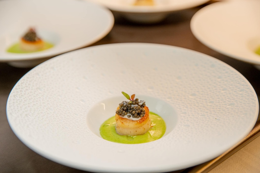 The evening was a blend of elegance, exquisite flavors, and impeccable service, all set in the luxurious ambiance of TOPAZ Restaurant. The event commenced with our Sturia Caviar Products, Hokkaido scallops, Tajima Wagyu beef striploin, truffled salt and paired with a decadent foie gras.